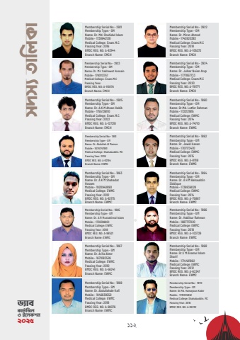 112m`m%u00a8 ZvwjKvMembership Serial No:- 2922Membership Type:- GMName: Dr. Miron AhmedMobile:- 1742820382Medical College: Enam.M.CPassing Year: 2018BMDC REG. NO: A-105272Branch Name: EMCHMembership Serial No:- 2921Membership Type:- GMName: Dr. Md. Shahidul IslamMobile:- 1738642128Medical College: Enam.M.CPassing Year: 2016BMDC REG. NO: A-83144Branch Name: EMCHMembership Serial No:- 2924Membership Type:- GMName: Dr. Julkar Naien ArupMobile:- 1777857733Medical College: Enam.M.CPassing Year: 2020BMDC REG. NO: A-119771Branch Name: EMCHMembership Serial No:- 2923Membership Type:- GMName: Dr. Mir Sakhawat HossainMobile:- 1790113757Medical College: Enam.M.CPassing Year: BMDC REG. NO: A-115876Branch Name: EMCHMembership Serial No:- 1860Membership Type:- GMName: Dr.Md. Lutfor Rahman Mobile:- 1722121815Medical College: EWMCPassing Year: 2014BMDC REG. NO: A-74710Branch Name: EWMCMembership Serial No:- 2925Membership Type:- GMName: Dr. A.K.M Ahsan HabibMobile:- 1755726110Medical College: Enam.M.CPassing Year: 2022BMDC REG. NO: A-127318Branch Name: EMCHMembership Serial No:- 1862Membership Type:- GMName: Dr. Jewel Hasan Mobile:- 1707173470Medical College: EWMCPassing Year: 2015BMDC REG. NO: A-81118Branch Name: EWMCMembership Serial No:- 1861Membership Type:- GMName: Dr. Abdullah Al Mamun Mobile:- 16741747981Medical College: Shahabuddin. MCPassing Year: 2016BMDC REG. NO: A-82194Branch Name: EWMCMembership Serial No:- 1864Membership Type:- GMName: Dr. A H M Bahauddin SiddiqueMobile:- 1739836028Medical College: EWMCPassing Year: 2014BMDC REG. NO: A-75867Branch Name: EWMCMembership Serial No:- 1863Membership Type:- GMName: Dr. A K M Shahadat Hossen Mobile:- 1920940890Medical College: EWMCPassing Year: 2012BMDC REG. NO: A-62175Branch Name: EWMCMembership Serial No:- 1866Membership Type:- GMName: Dr. Habibur Rahman Mobile:- 1687717020Medical College: EWMCPassing Year: 2018BMDC REG. NO: A-103729Branch Name: EWMCMembership Serial No:- 1865Membership Type:- GMName: Dr. A R Mustakimul Islam Mobile:- 1738396951Medical College: EWMCPassing Year: 2018BMDC REG. NO: A-98521Branch Name: EWMCMembership Serial No:- 1868Membership Type:- GMName: Dr.S M Anamul Islam Sharif Mobile:- 1714481862Medical College: EWMCPassing Year: 2012BMDC REG. NO: A-62247Branch Name: EWMCMembership Serial No:- 1867Membership Type:- GMName: Dr. Arifa Akter Mobile:- 1671083526Medical College: EWMCPassing Year: 2010BMDC REG. NO: A-56241Branch Name: EWMCMembership Serial No:- 1870Membership Type:- GMName: Dr.Md. Humayoun KabirMobile:- 1731235842Medical College: Shahabuddin. MCPassing Year: 2016BMDC REG. NO: A-85732Membership Serial No:- 1869Membership Type:- GMName: Dr. Abdullahale KafiMobile:- 1946939550Medical College: EWMCPassing Year: 2018BMDC REG. NO: A-99076Branch Name: EWMCW%u00a8veKvDw%u00ddj I B%u2021jKkb 2025