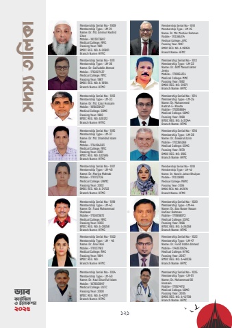 121m`m%u00a8 ZvwjKvMembership Serial No:- 1010Membership Type:- LM-25Name: Dr. Md. Moshiur Rahman Mobile:- 1713365274Medical College: JIMCPassing Year: 1997BMDC REG. NO: A-28059Branch Name: HFMCMembership Serial No:- 1009Membership Type:- LM-24Name: Dr. Md. Aminur Rashid LitonMobile:- 1823073697Medical College: MMCPassing Year: 1991BMDC REG. NO: A-20801Branch Name: HFMCMembership Serial No:- 1012Membership Type:- LM-32Name: Dr. AKM Masud Akter JeetuMobile:- 1710854134Medical College: MMCPassing Year: 1992BMDC REG. NO: 22971Branch Name: HFMCMembership Serial No:- 1011Membership Type:- LM-26Name: Dr. Saifuddin AhmedMobile:- 1715027437Medical College: MMCPassing Year: 1987BMDC REG. NO: A-18184Branch Name: HFMCMembership Serial No:- 1014Membership Type:- LM-35Name: Dr. Muhammed Kudrat-E- KhudaMobile:- 1712158884Medical College: SBMCPassing Year: 1999BMDC REG. NO: A-31344Branch Name: HFMCMembership Serial No:- 1013Membership Type:- LM-33Name: Dr. Md. Ezaz Hossain Mobile:- 1819239427Medical College: SBMCPassing Year: 1990BMDC REG. NO: A20212Branch Name: HFMCMembership Serial No:- 1016Membership Type:- LM-38Name: Dr. Anwarul Azim Mobile:- 1713365269Medical College: SSMCPassing Year: 1979BMDC REG. NO: 8185Branch Name: HFMCMembership Serial No:- 1015Membership Type:- LM-37Name: Dr. Md. Shahidul Islam KhanMobile:- 1714294583Medical College: MMCPassing Year: 2001BMDC REG. NO: A32585Branch Name: HFMCMembership Serial No:- 1018Membership Type:- LM-42Name: Dr. Nasrin Jahan BhuiyanMobile:- 1713328913Medical College: MBMCPassing Year: 2006BMDC REG. NO: A47276Branch Name: HFMCMembership Serial No:- 1017Membership Type:- LM-40Name: Dr. Mariya MahtabMobile:- 1711172736Medical College: UWMCPassing Year: 2002BMDC REG. NO: A-34723Branch Name: HFMCMembership Serial No:- 1020Membership Type:- LM-44Name: Dr. Abu Naser Hasan Hafizur RahmanMobile:- 1711958073Medical College: SSMCPassing Year: 1996BMDC REG. NO: A-26358Branch Name: HFMCMembership Serial No:- 1019Membership Type:- LM-43Name: Dr. Fuad Mohammad ShaheedMobile:- 1712673672Medical College: MMCPassing Year: 2003BMDC REG. NO: A-38258Branch Name: HFMCMembership Serial No:- 1023Membership Type:- LM-47Name: Dr. Farid Uddin Ahmed Mobile:- 1740572634Medical College: HFMCPassing Year: 2007BMDC REG. NO: A-48036Branch Name: HFMCMembership Serial No:- 1022Membership Type:- LM %u2013 46Name: Dr. Anar KoliMobile:- 1711137762Medical College: RMCPassing Year: 1994BMDC REG. NO: Branch Name: HFMCMembership Serial No:- 1025Membership Type:- LM-51Name: Dr. Mohammad Oli Hossain Mobile:- 1711574712Medical College: SBMCPassing Year: 2005BMDC REG. NO: A-42709Branch Name: HFMCMembership Serial No:- 1024Membership Type:- LM-50Name: Dr. Kazi Shariful Islam Mobile:- 1678039147Medical College: USTCPassing Year: 2000BMDC REG. NO: A-42117Branch Name: HFMCW%u00a8veKvDw%u00ddj I B%u2021jKkb 2025
