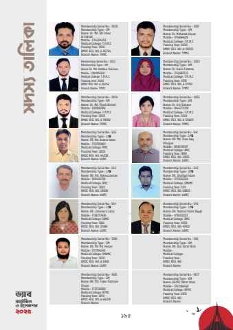 195m`m%u00a8 ZvwjKvMembership Serial No:- 2931Membership Type:- GMName: Dr. Meharab HasanMobile:- 1715694629Medical College: T.M.M.CPassing Year: 2020BMDC REG. NO: A-110223Branch Name: TMMCMembership Serial No:- 2930Membership Type:- GMName: Dr. Md. Abi Umar Al FattahMobile:- 1714304203Medical College: T.M.M.CPassing Year: 2016BMDC REG. NO: A-85754Branch Name: TMMCMembership Serial No:- 2933Membership Type:- GMName: Dr. Kanis FatemaMobile:- 1745683133Medical College: T.M.M.CPassing Year: 2019BMDC REG. NO: A-117102Branch Name: TMMCMembership Serial No:- 2932Membership Type:- GMName: Dr. Md. Habibur RahmanMobile:- 1762814350Medical College: T.M.M.CPassing Year: 2020BMDC REG. NO: A-114743Branch Name: TMMCMembership Serial No:- 2935Membership Type:- GMName: Dr. Irin SultanaMobile:- 1945773338Medical College: T.M.M.CPassing Year: 2022BMDC REG. NO: A-125601Branch Name: TMMCMembership Serial No:- 2934Membership Type:- GMName: Dr. Md. Riyad AhmedMobile:- 1581082941Medical College: T.M.M.CPassing Year: 2020BMDC REG. NO: A-118182Branch Name: TMMCMembership Serial No:- 541Membership Type:- LM%ufffdName: DR. Md. Ziaul Haq BhuiyanMobile:- 1819238797Medical College: BMCPassing Year: 1998BMDC REG. NO: 29125Branch Name: UAMCMembership Serial No:- 535Membership Type:- LM%ufffdName: DR. Md. Anarul IslamMobile:- 1712700901Medical College: MMCPassing Year: 2005BMDC REG. NO: 44338Branch Name: UAMCMembership Serial No:- 543Membership Type:- GM%ufffdName: DR. Shafiqul IslamMobile:- 1717555359Medical College: SMAMCPassing Year: 2011BMDC REG. NO: 56852Branch Name: UAMCMembership Serial No:- 542Membership Type:- LM%ufffdName: DR. Md. RoknuzzamanMobile:- 1611405730Medical College: RMCPassing Year: 2003BMDC REG. NO: 38926Branch Name: UAMCMembership Serial No:- 545Membership Type:- LM%ufffdName: DR. Nazmul Islam BappiMobile:- 1711830303Medical College: BMCPassing Year: 2005BMDC REG. NO: 47822Branch Name: UAMCMembership Serial No:- 544Membership Type:- LM%ufffdName: DR. Jahanara LaizuMobile:- 1726737476Medical College: SBMCPassing Year: 1999BMDC REG. NO: 31596Branch Name: UAMCMembership Serial No:- 265Membership Type:- GMName: DR. Abu Safar NickMobile:- Medical College: Passing Year: BMDC REG. NO: Branch Name:Membership Serial No:- 1260Membership Type:- GMName: DR. Mir Md. HasanMobile:- 1717104342Medical College: SMAMCPassing Year: 2010BMDC REG. NO: A-5893Branch Name: UAMCMembership Serial No:- 1927Membership Type:- GMName: DR.MD. Abrar AlomMobile:- 1767296450Medical College: RPMCPassing Year: 2013BMDC REG. NO: Branch Name:Membership Serial No:- 1925Membership Type:- GMName: DR. MD. Fojlur Rahman Shuvo Mobile:- 1737390812Medical College: RPMCPassing Year: 2012BMDC REG. NO: A-56378Branch Name:W%u00a8veKvDw%u00ddj I B%u2021jKkb 2025