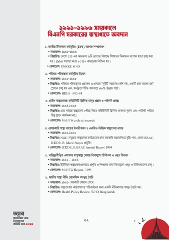 22W%u00a8veKvDw%u00ddj G%u00db B%u2021jKkbKwgwU nve20251991-1996 mgqKv%u2021jweGbwc miKv%u2021ii %ufffdv%ufffd%u00a8Lv%u2021Z Ae`vb1. RvZxq wUKv`vb Kg%u00a9m~wPi (EPI) e%u00a8vcK m%u00a4c%u00d6mviY %u2022 mgqKvj: 1991%u00d11996 %u2022 we%u00af%u00cdvwiZ: %u2020`%u2021k EPI-Gi AvIZvq 6wU %u2020iv%u2021Mi wei%u00e6%u2021%u00d7 wk%u00ef%u2021`i wUKv`vb e%u00a8vcK nv%u2021i Pvjy Kiv nq| 1993 mv%u2021ji g%u2021a%u00a8 80%+ Kfv%u2021iR wbw%u00f0Z nq| %u2022 %u2020idv%u2021i%u00dd:UNICEF, WHO2. cwievi cwiK%u00edbv Kg%u00a9m~wPi Db%u0153qb%u2022 mgqKvj: 1991%u00d11995%u2022 we%u00af%u00cdvwiZ: cwievi cwiK%u00edbvi c%u00d6PviYv I c%u00d6mv%u2021i %u00d2`yBwU m%u0161%u00cdv%u2021bi %u2020ewk bq, GKwU n%u2021j fv%u2021jv nq%u00d3 %u2020%u00af%u00f8vMvb Pvjy nq Ges KbU%u00aav%u2021mcwUf e%u00a8env%u2021i 50% Db%u0153qb N%u2021U|%u2022 %u2020idv%u2021i%u00dd:BDHS1993-943. M%u00d6vgxY %u00af^v%u00af%u2019%u00a8%u2021mevq KwgDwbwU wK%u00acwbK Pvjyi c%u00d6%u00af%u00cdve I cvBjU c%u00d6K%u00ed%u2022 mgqKvj: 1994-1995%u2022 we%u00af%u00cdvwiZ: M%u00d6vg ch%u00a9v%u2021q %u00af^v%u00af%u2019%u00a8%u2021mev %u2020cu%u0160%u2021Q w`%u2021Z KwgDwbwU wK%u00acwbK aviYvi m~Pbv Ges cvBjU ch%u00a9v%u2021q wKQz %u00af%u2019v%u2021b Kvh%u00a9%u00b5g Pvjy|%u2022 %u2020idv%u2021i%u00dd:MoHFW archival records4. %u2020emiKvwi %u00af^v%u00af%u2019%u00a8 Lv%u2021Zi D`vixKiY I GbwRI-wfw%u00cbK %u00af^v%u00af%u2019%u00a8%u2021mev c%u00d6mvi%u2022 mgqKvj: 1991-1996%u2022 we%u00af%u00cdvwiZ:NGO-mg~%u2021ni %u00af^v%u00af%u2019%u00a8%u2021mev Kvh%u00a9%u00b5%u2021gi Rb%u00a8 miKvwi mn%u2021hvwMZv e%u201ew%u00d7 cvq, %u2020hgb BRAC,ICDDR, B, Marie Stopes c%u00d6f%u201ewZ|%u2022 %u2020idv%u2021i%u00dd:ICDDR,B, BRAC Annual Report19945. `vwi`%u00aa%u00a8cxwoZ GjvKvq gvZ%u2026%u00af^v%u00af%u2019%u00a8 %u2020mevq webvg~%u2021j%u00a8 wPwKrmv I Ilya weZiY%u2022 mgqKvj: 1992 - 1996%u2022 we%u00af%u00cdvwiZ: BDwbqb %u00af^v%u00af%u2019%u00a8%u2021K%u203a`%u00aa%u00b8%u2021jv%u2021Z c%u00d6m~wZ I wk%u00ef%u2021`i Rb%u00a8 webvg~%u2021j%u00a8 Ilya I wPwKrmv%u2021mev Pvjy|%u2022 %u2020idv%u2021i%u00dd:MoHFW Report, 19956. RvZxq %u00af^v%u00af%u2019%u00a8 bxwZ (c%u00d6v_wgK Lmov) %u02c6Zwi%u2022 mgqKvj: 1996 (miKvwi %u2020gqv` %u2020k%u2021l)%u2022 we%u00af%u00cdvwiZ: %u00af^v%u00af%u2019%u00a8%u2021mevq KvVv%u2021gvMZ cwieZ%u00a9%u2021bi Rb%u00a8 GKwU bxwZgvjvi Lmov %u02c6Zwi nq|%u2022 %u2020idv%u2021i%u00dd:Health Policy Review, WHO Bangladesh